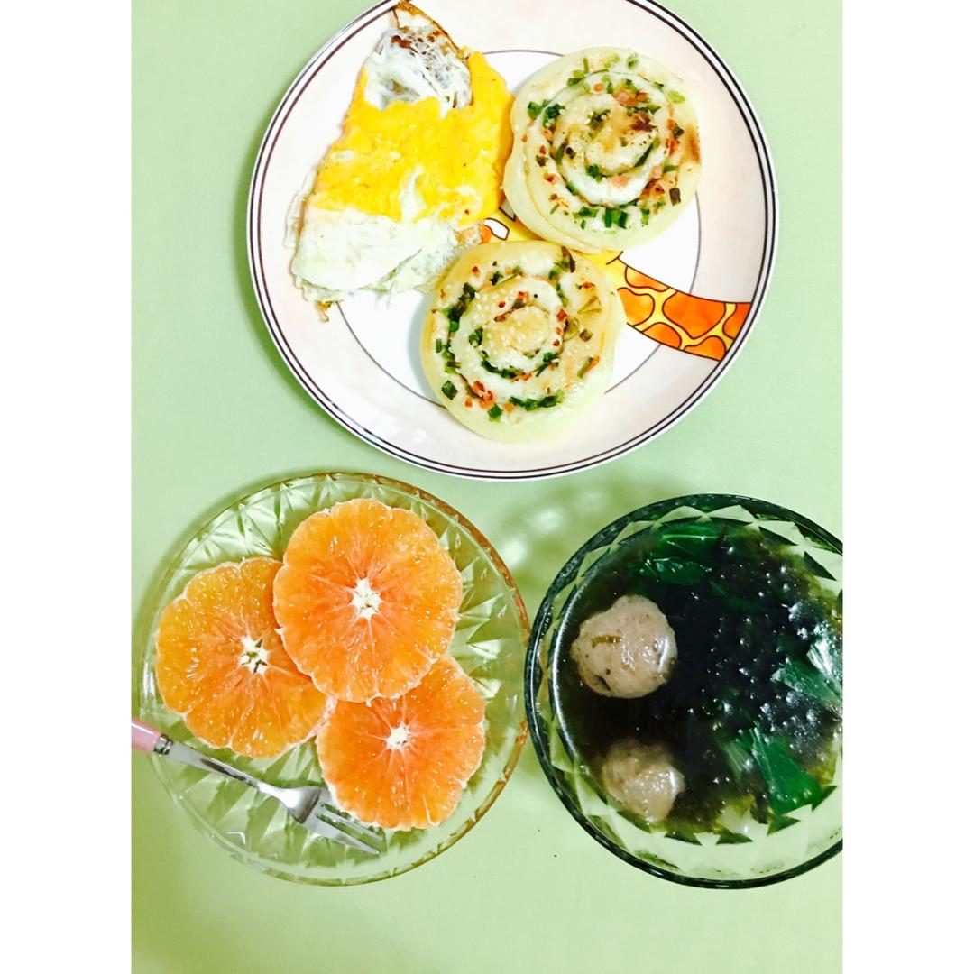 周一早安!今天早餐有葱油饼、煎蛋、牛肉丸紫菜青菜汤,还有红橙(^_^)