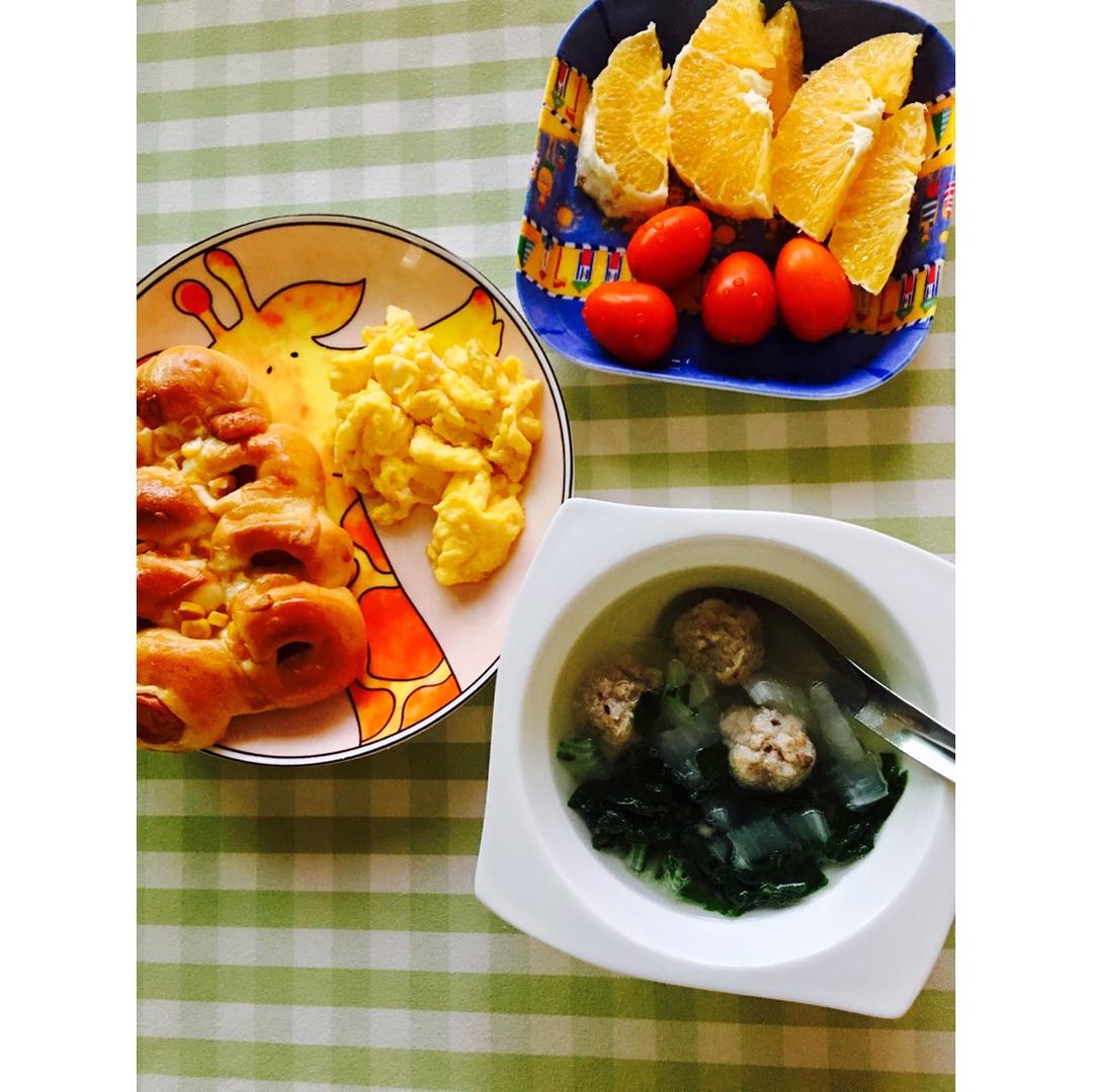 早安!今天吃肉末丸子蔬菜汤、牛奶炒蛋、面包,还有水果