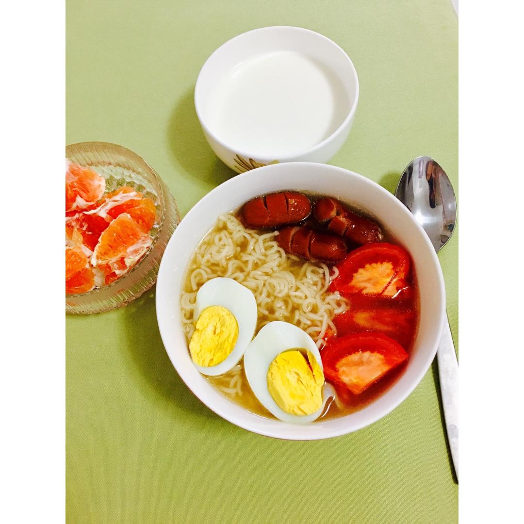 早安!今天吃餐蛋面,还有一碗热牛奶(^_^)