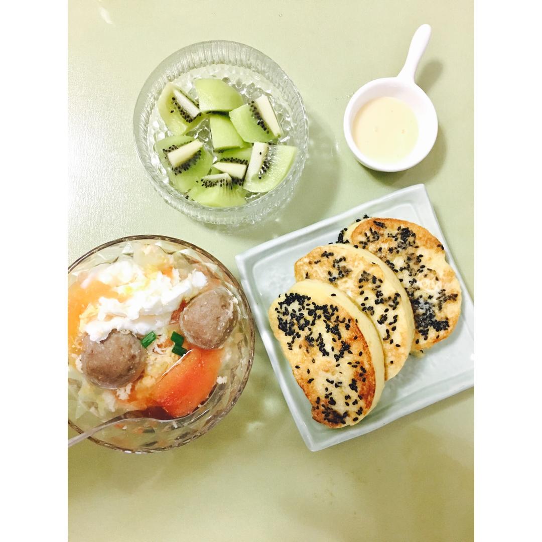 黑芝麻煎玉米馒头片,蘸炼奶吃,香!还有牛肉丸杂菜蛋汤、水果(^_^)