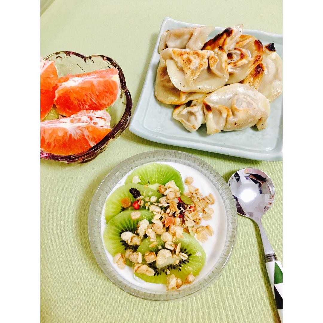 早安!今天吃煎饺,还有水果卡乐比酸奶、红橙(^_^)