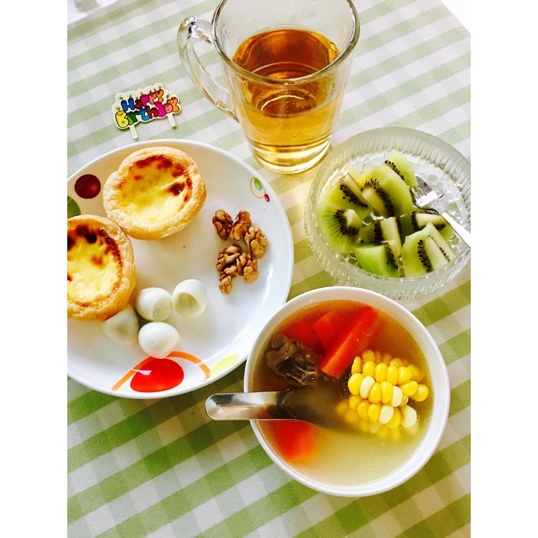 早安!今天继续喝汤,胡萝卜玉米排骨汤,蛋挞➕鹌鹑蛋,核桃➕奇异果,还有罗汉果茶