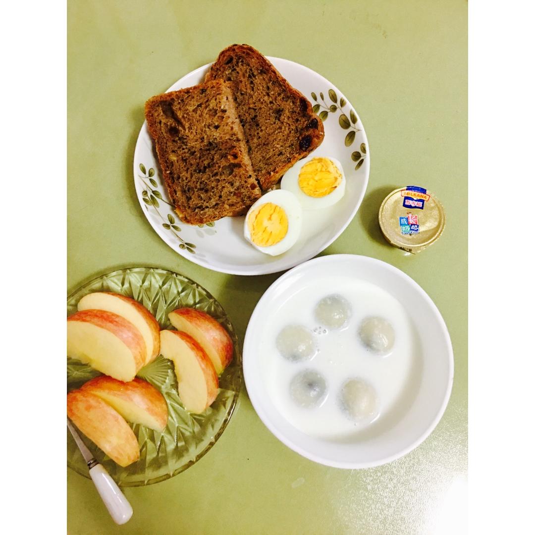 早安!昨晚做好的红糖杂果面包,满满的核桃芝麻哦!还有牛奶芝麻汤圆,还有水煮蛋加水果😯