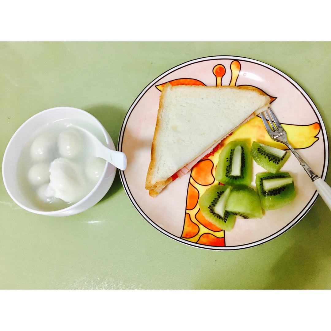 早安!今天喝陈皮红豆薏米汤,搭配三明治、红薯、小块鸡扒,还有水果(^_^)