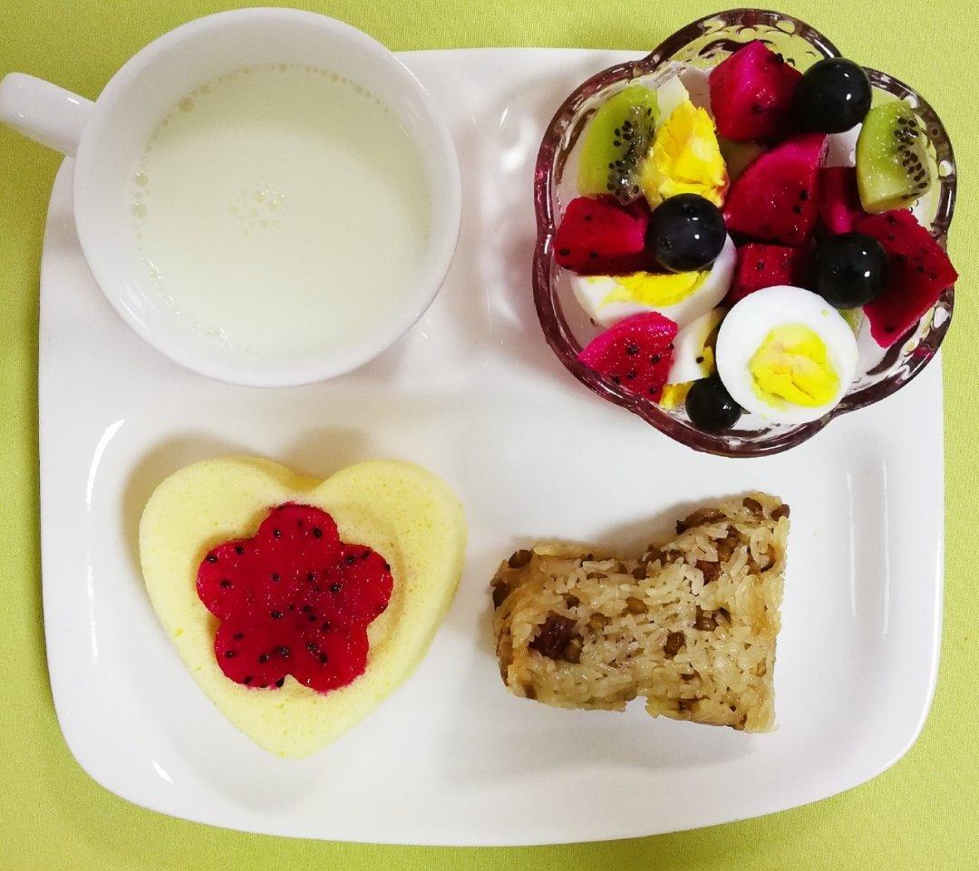 椰香戚风、粽子、鸡蛋水果沙拉、牛奶~