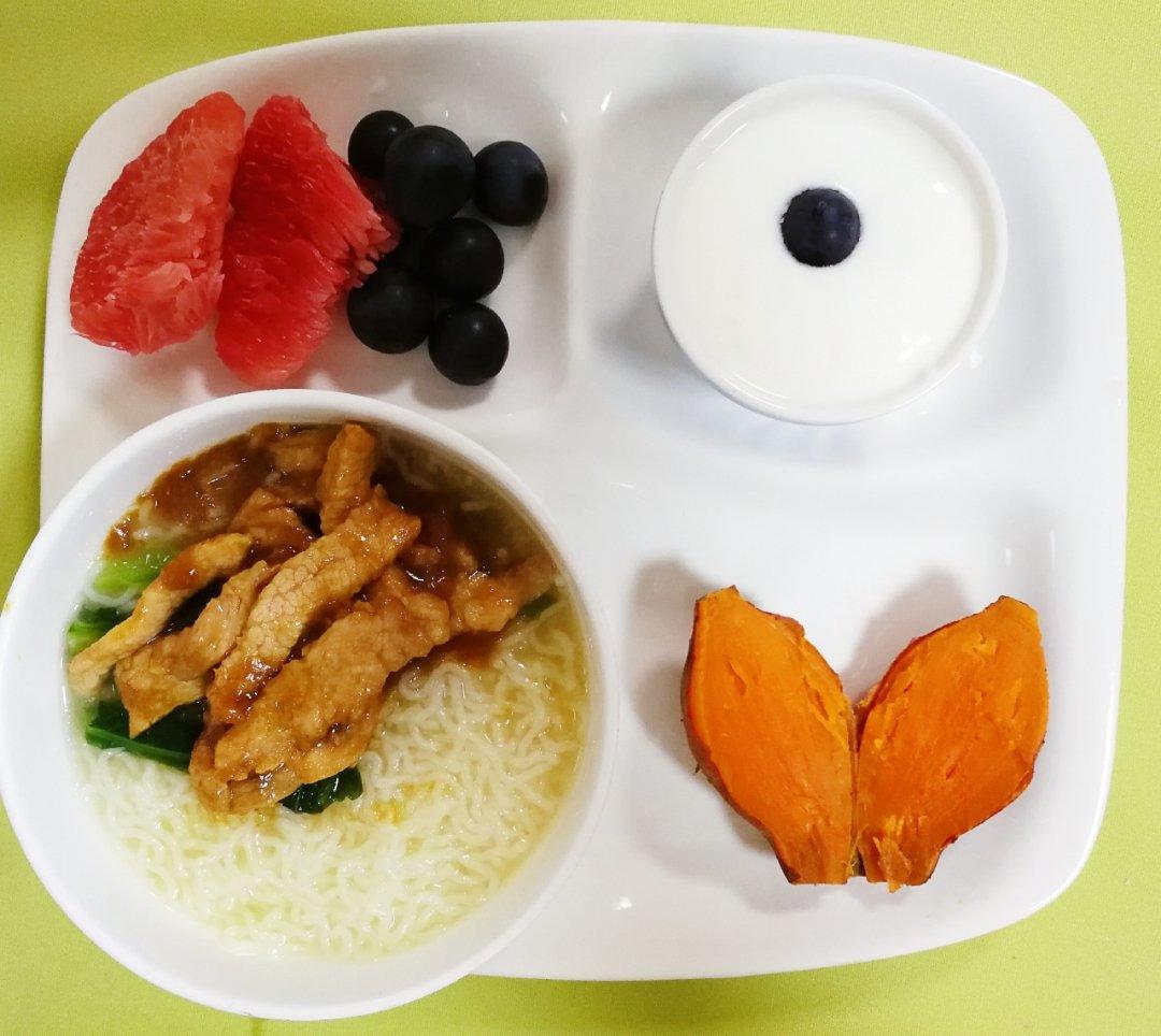 瘦肉汤米粉、红薯、酸奶、水果~
