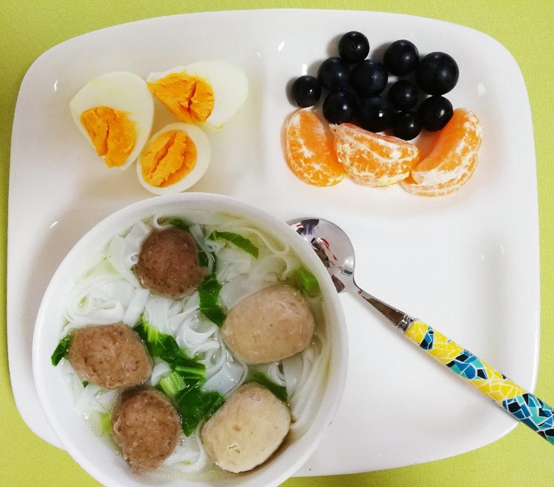 双丸粿条汤、水煮蛋、水果~