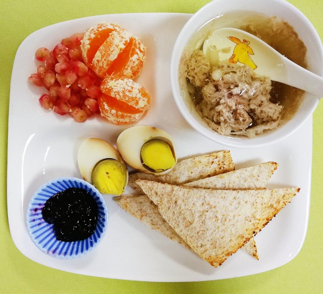 麦冬炖瘦肉汤、茶叶蛋、烤吐司配果酱、水果~