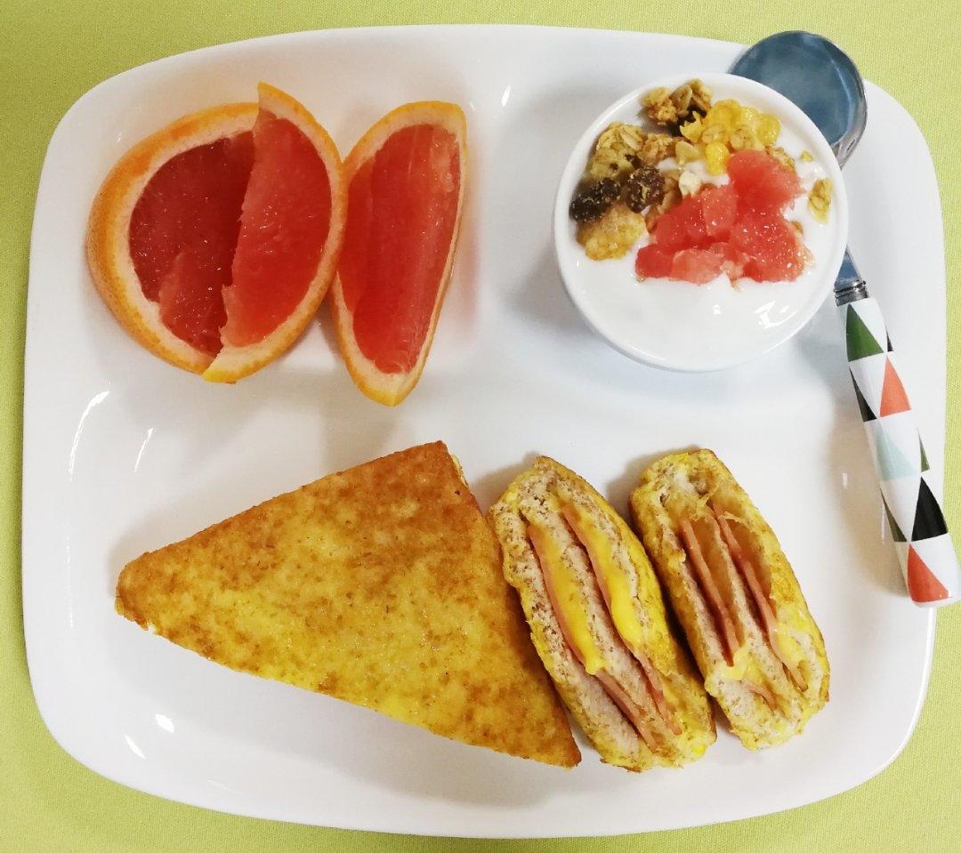火腿芝士西多士、谷物酸奶、西柚~早安,亲们😊
