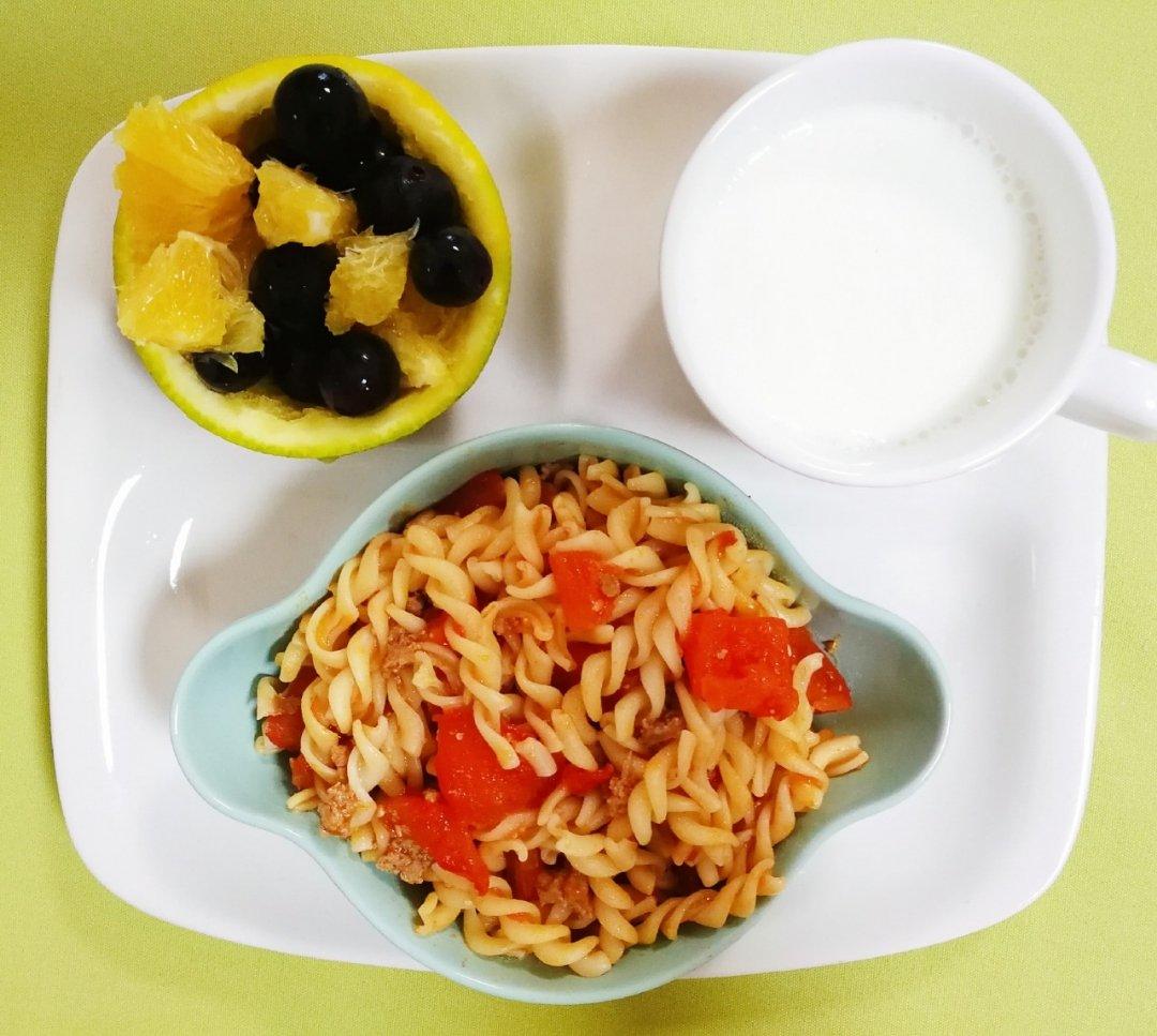 番茄肉酱意粉、牛奶、水果~