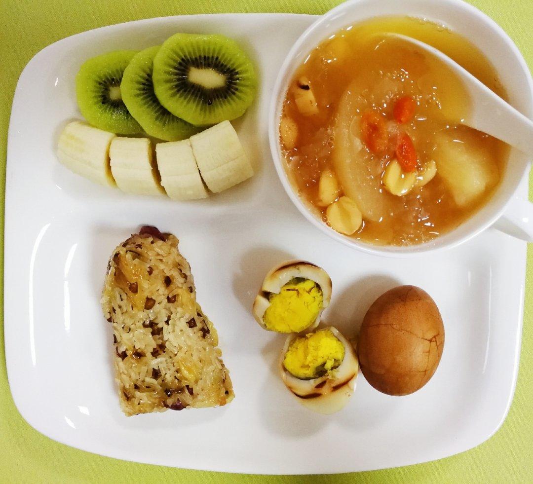 五香茶叶蛋、莲子雪耳梨羹、粽子、水果。妞喜欢吃外婆包的粽子,国庆假...