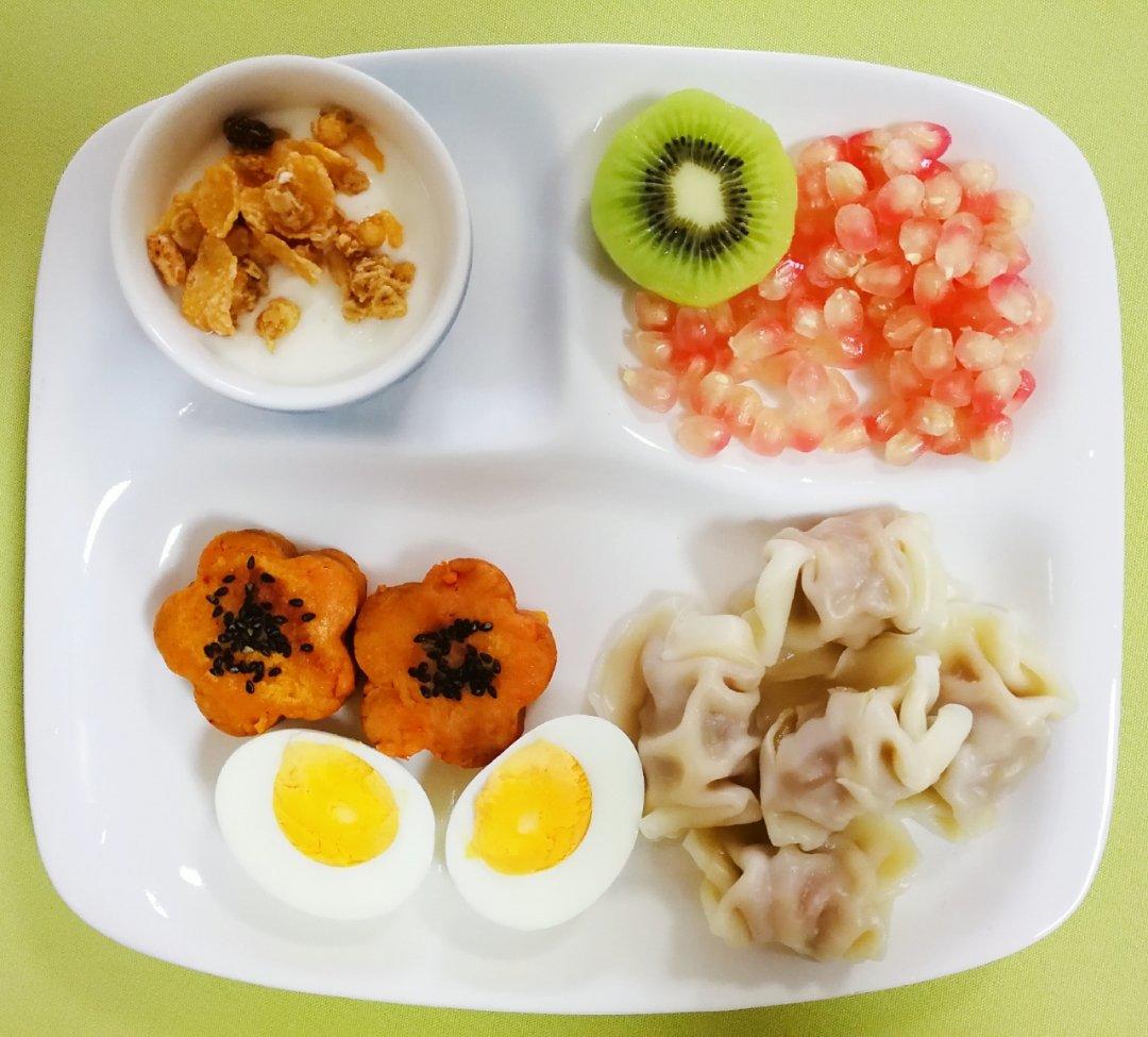 红薯饼、饺子、水煮蛋、谷物酸奶、水果~