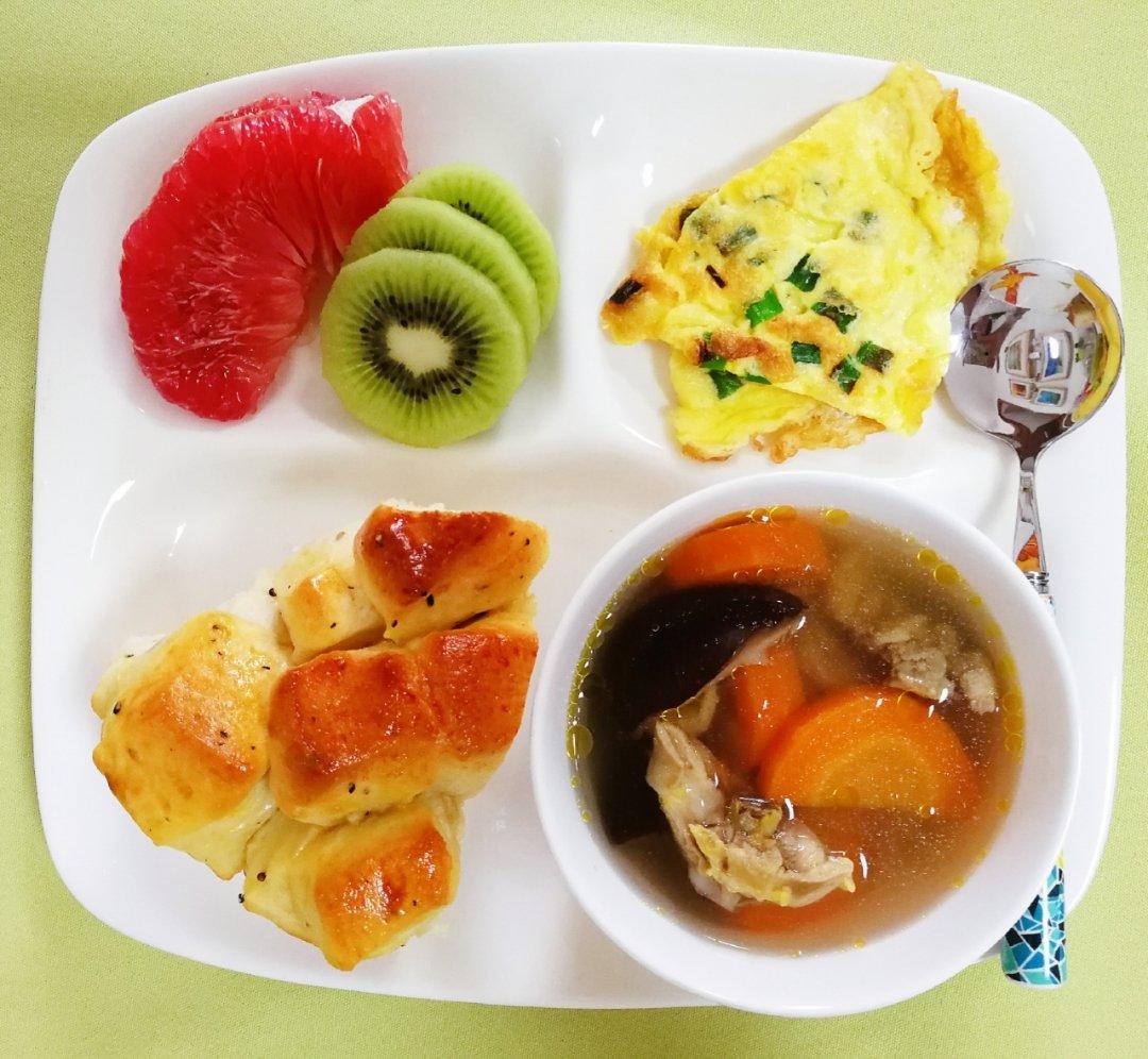 香菇胡萝卜鸡汤、果干面包、葱香蛋饼、水果~
