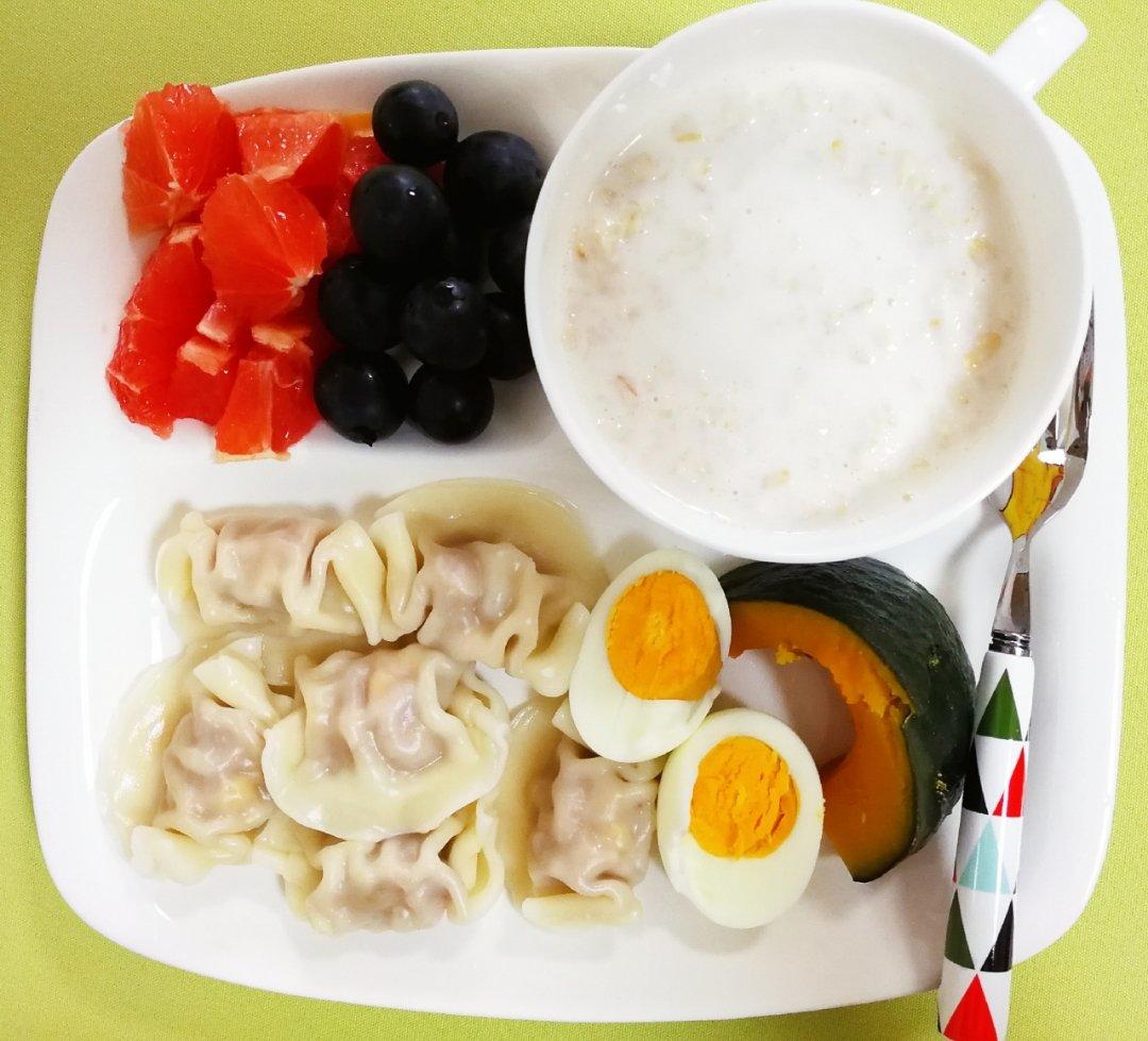 玉米饺子、贝贝南瓜、水煮蛋、牛奶燕麦粥、水果~