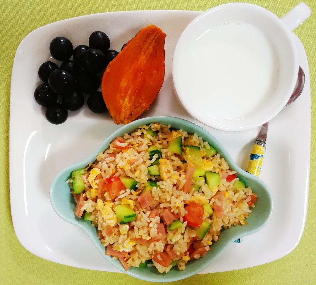 火腿杂蔬炒饭、红薯、牛奶、水果~