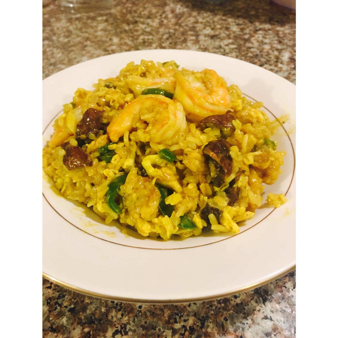 放了咖喱粉和青咖喱酱……炒的稍微有点湿了……不过味道还是棒棒哒!