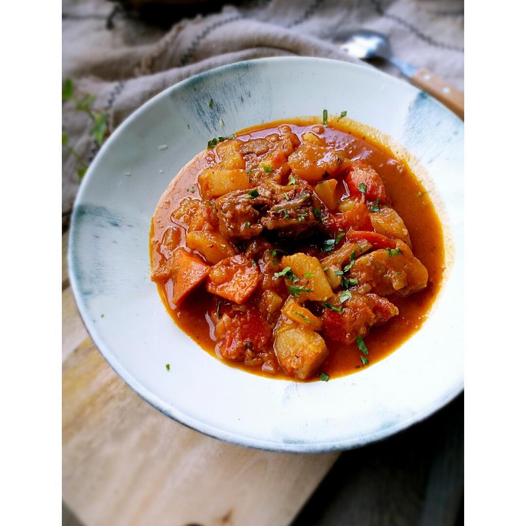 放了红白萝卜,土豆,芹菜,洋葱和番茄,铸铁锅炖了不到三小时就已软烂,拌上米饭...