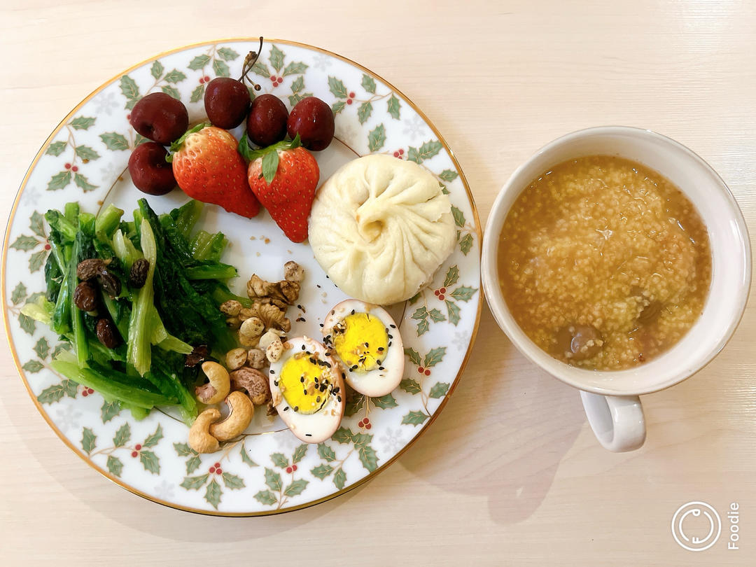 原本该昨天早上吃的小米山药红枣莲子板栗粥➕酱肉包子,鸡蛋➕坚果,水果➕蔬菜。包子仍然是小伙伴投喂...