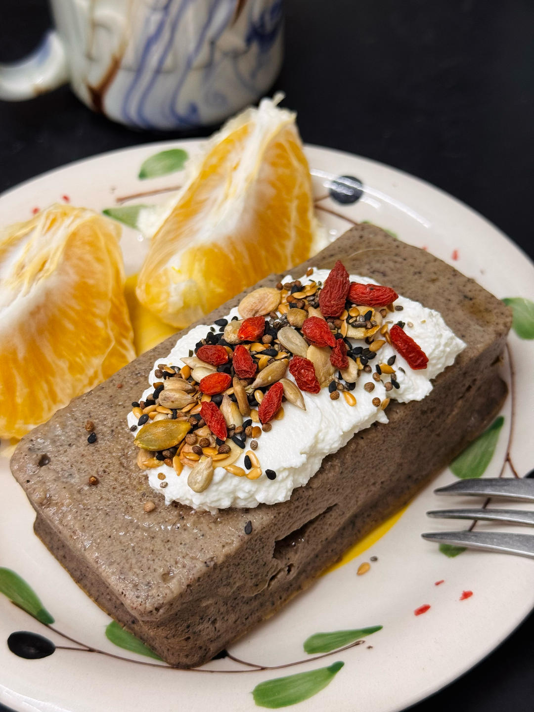 早餐吃山药黑芝麻蛋糕🍰+葡萄柚🍊+绿茶🍵
