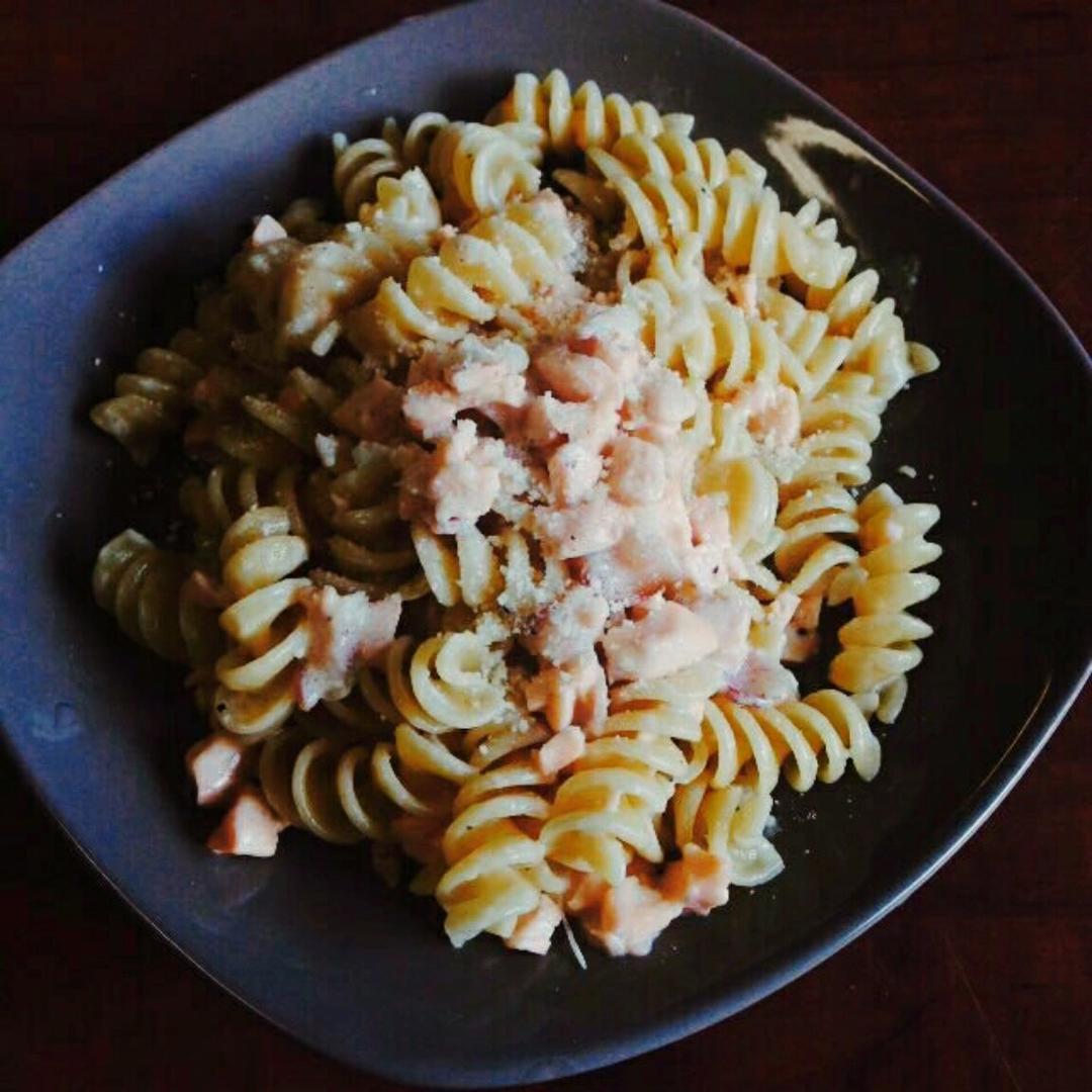 午饭是三文鱼培根意面。大中午的新鲜买回来的三文鱼,和奶油培根一起烧着吃。在十五分钟之内做了...