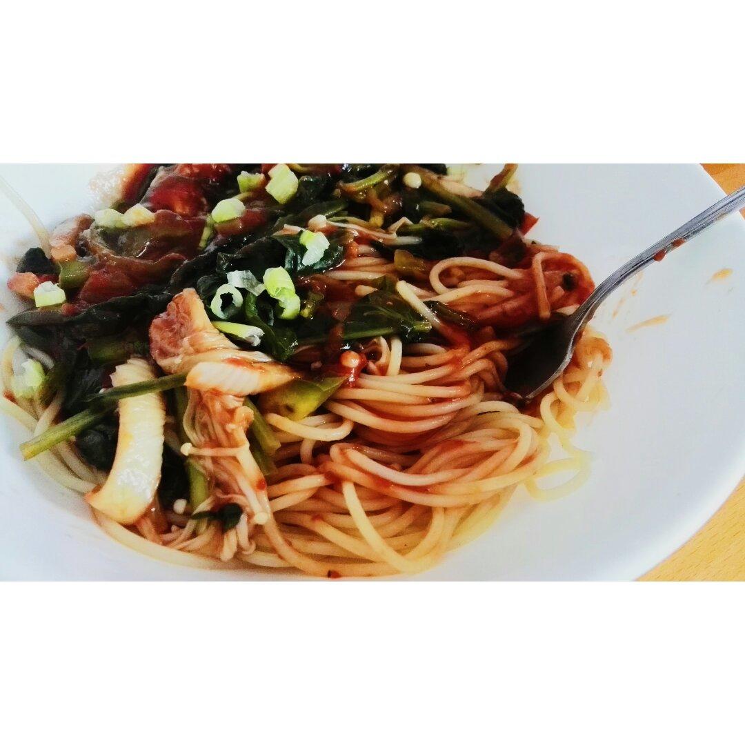做了个超级接地气的版本,用金针菇+菠菜+超市买的番茄意面罐头