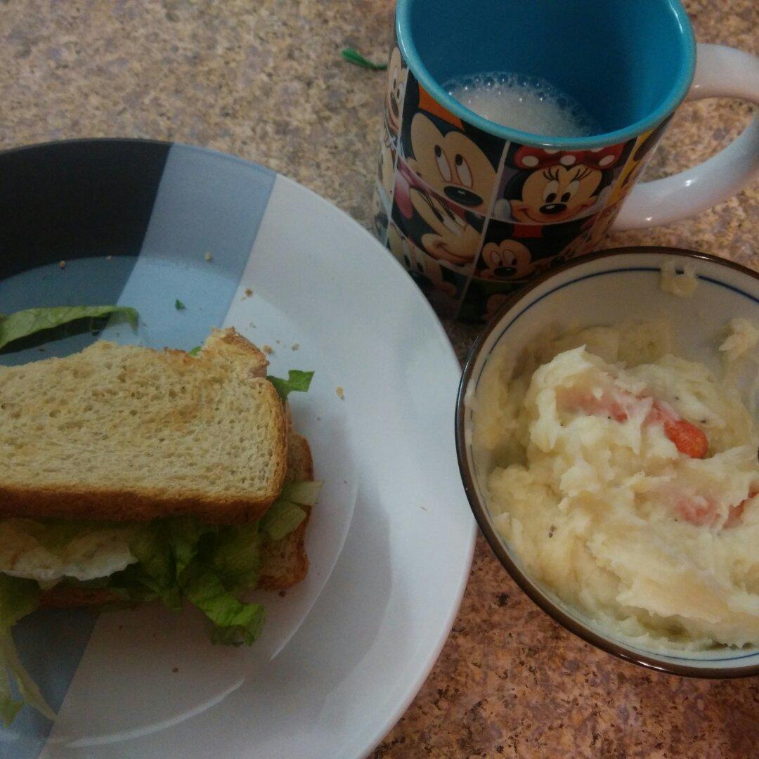 三明治(微波鸡蛋,菠菜,honey mustard), 牛奶燕麦,土豆泥,胡萝卜。