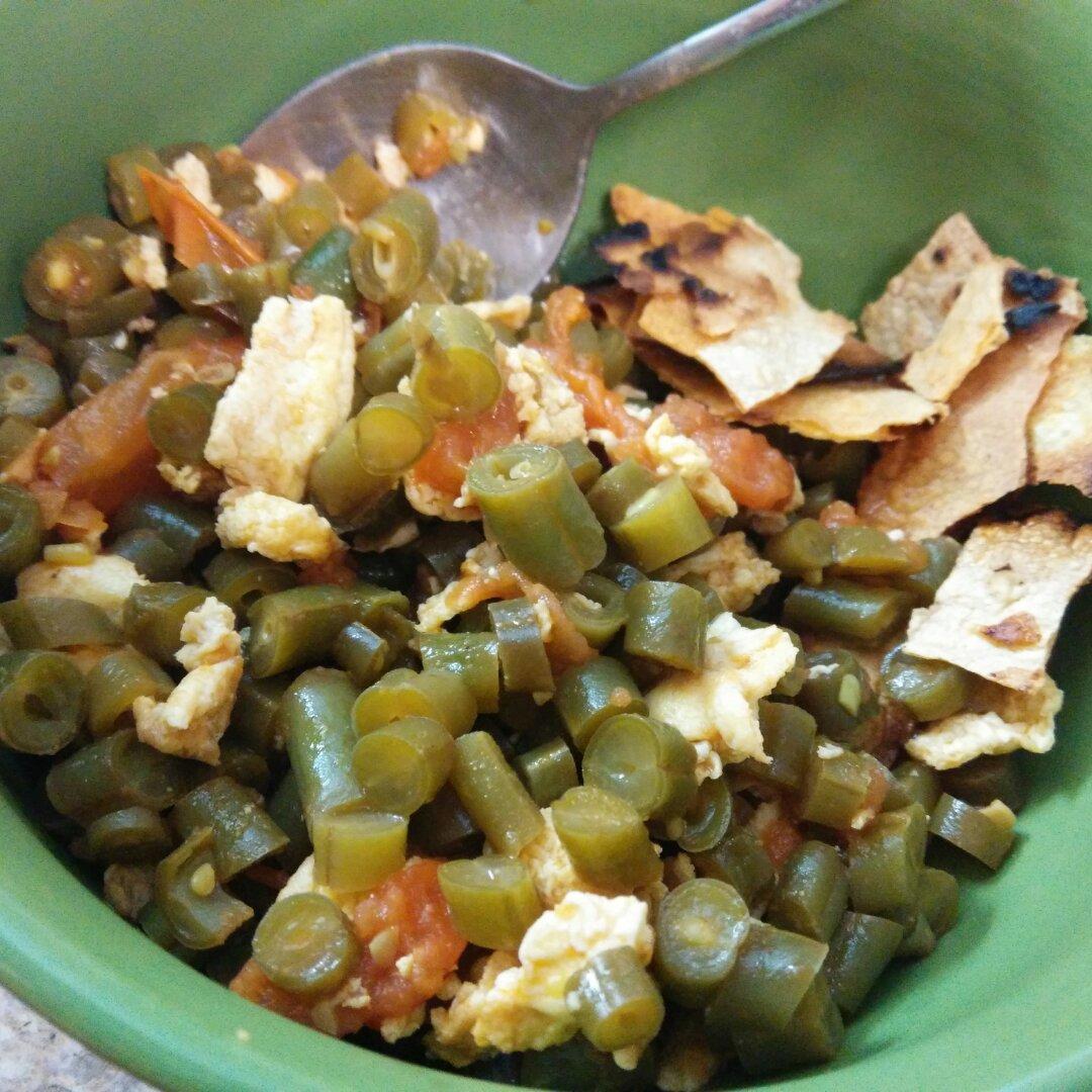 西红柿豆角鸡蛋,玉米饼碎。