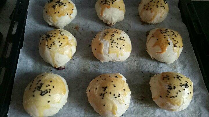 买的红豆馅有点甜,猪油千万不能够液态状(刚做好放凉)就用……要不然油酥粘手得要命