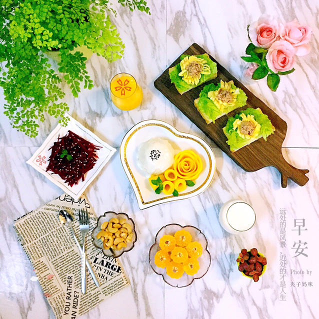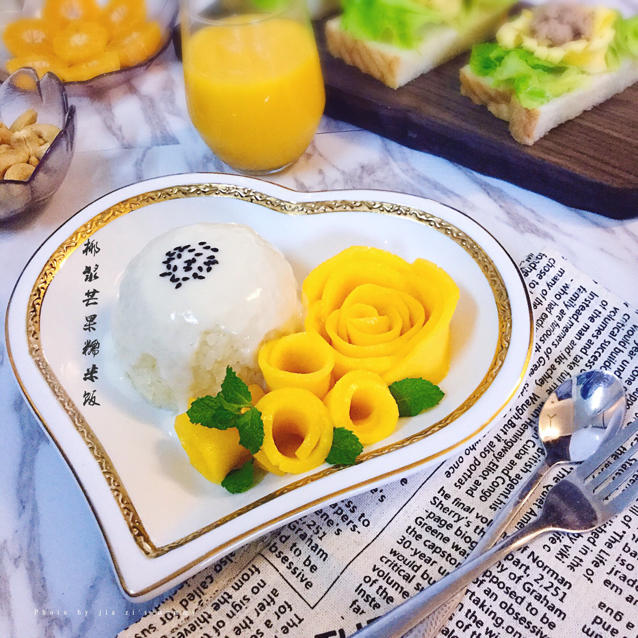 早餐有泰式椰浆芒果糯米饭,鸡蛋金枪鱼三明治,凉拌甜菜根,芒果汁,鲜奶,原味烤腰果,水果! #早...