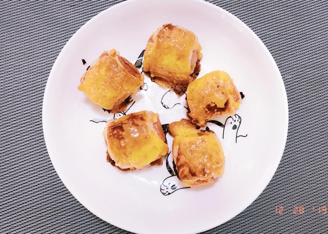 早餐:手抓饼卷火腿肠(烤的有点过头卖相不太好,不该加芝士片化了之后影响形象)