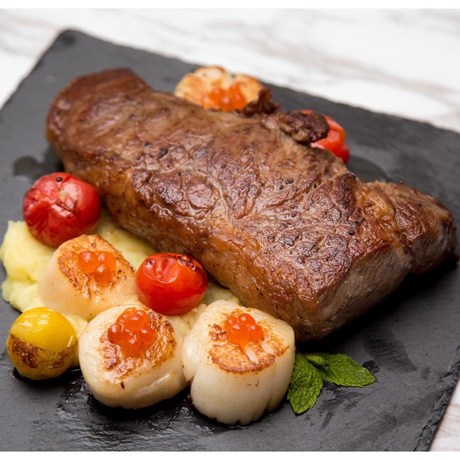 五分熟AAA牛排加带子配三文鱼籽 下面是牛油土豆泥