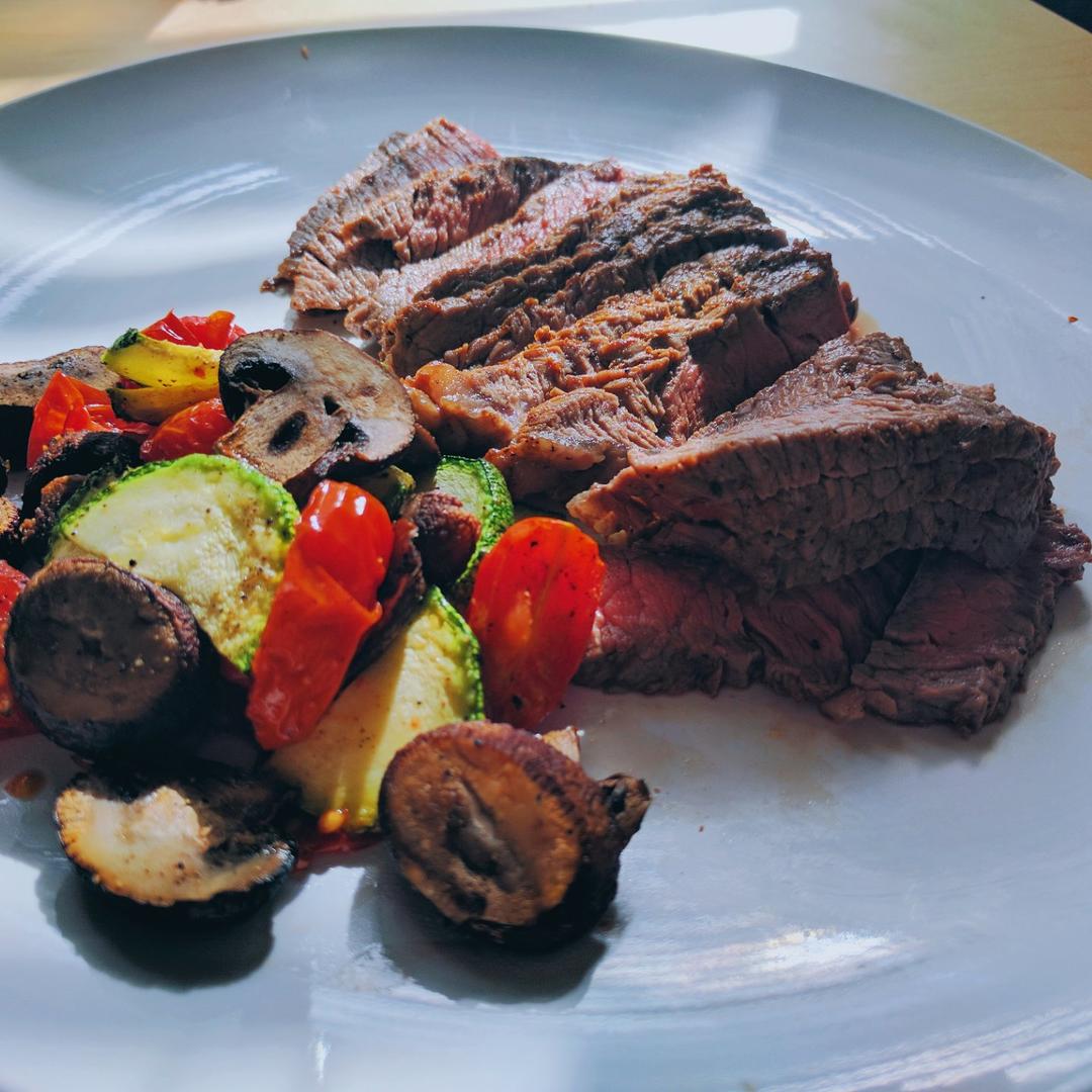 煎牛排配烤蘑菇西葫芦圣女果