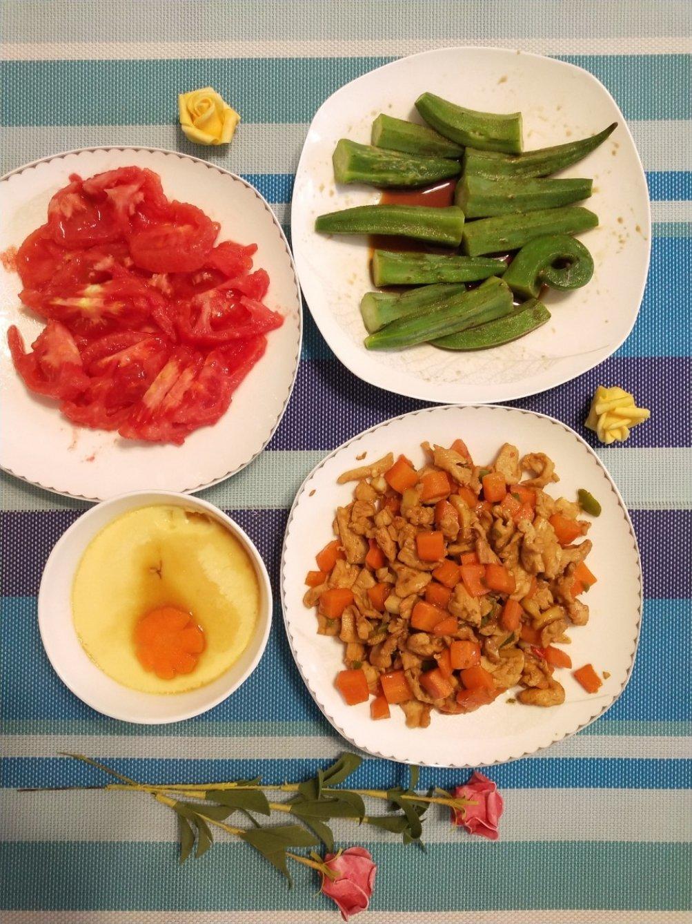 红萝卜鸡丁,凉拌秋葵,西红柿,蒸蛋!