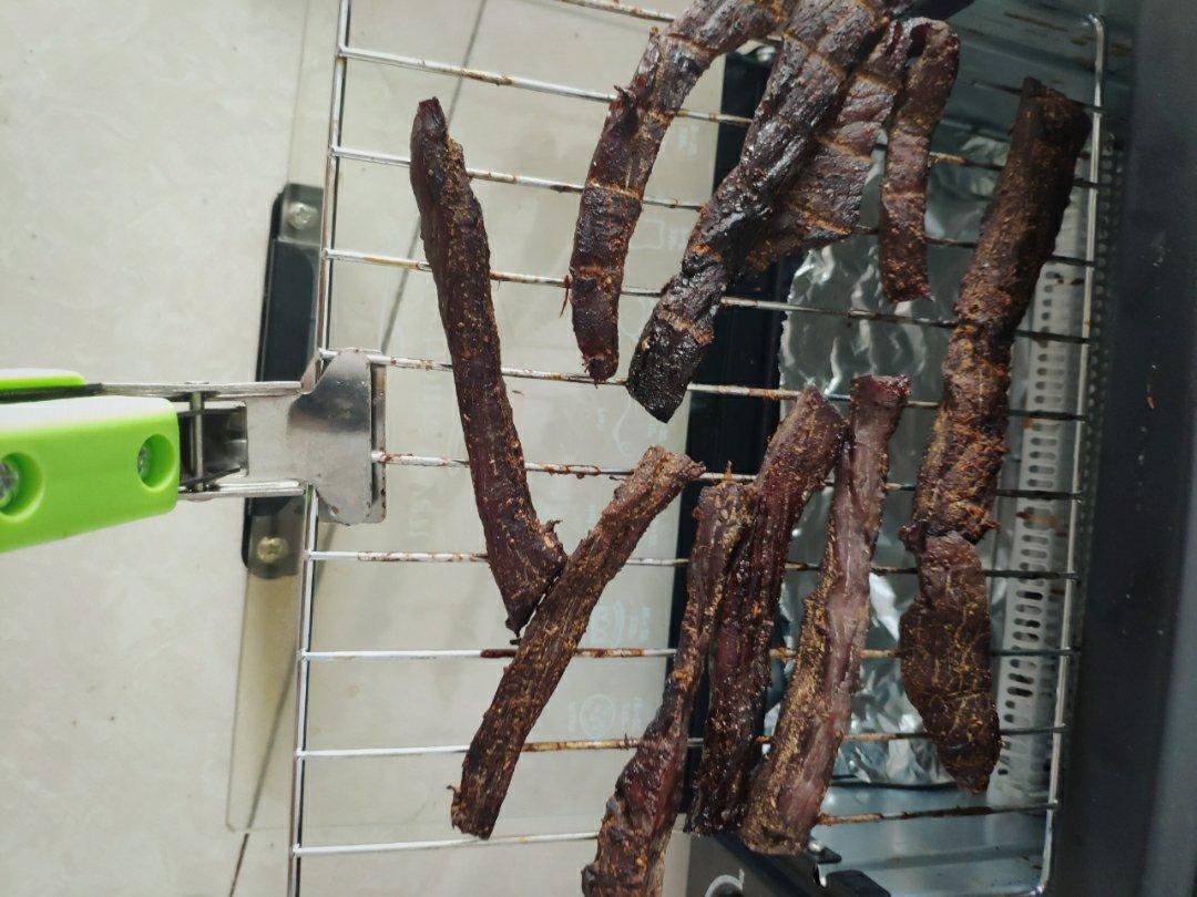五香牛肉干,没放辣椒,但放了辣鲜露,还是有点辣味。第一次做,微波炉70火力,5分钟就有些硬了。