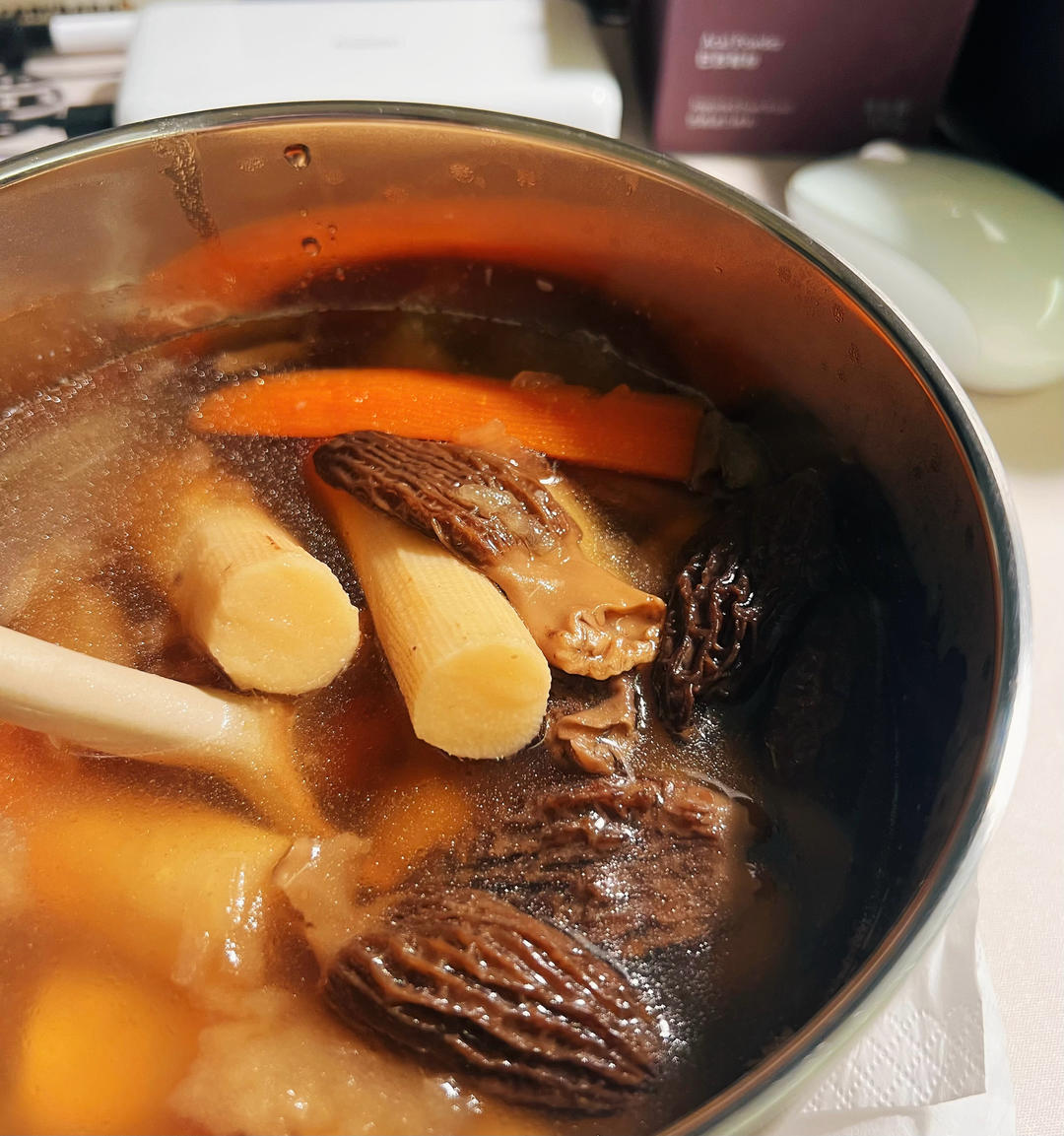羊肚菌瘦肉苹果胡萝卜淮山无花果莲子汤。