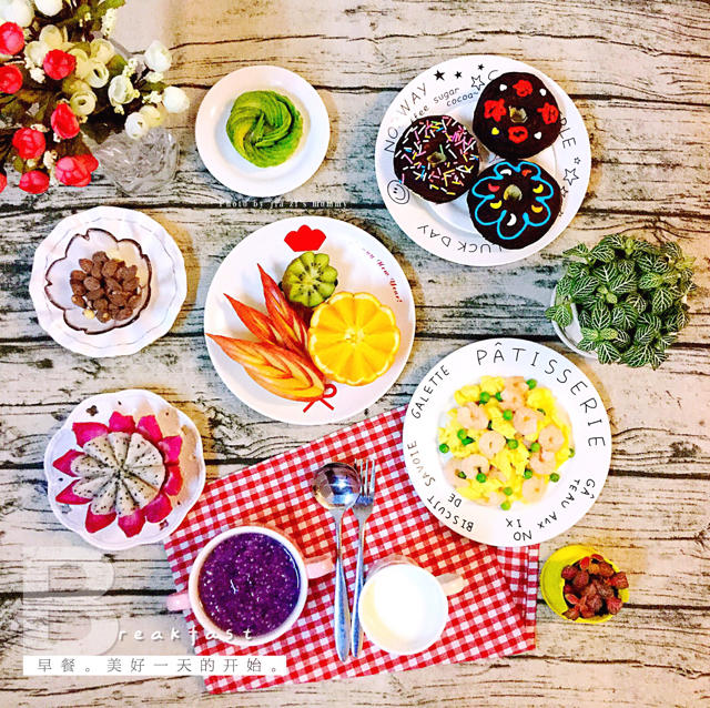 今天早餐有紫薯粗粮粥,巧克力甜甜圈,虾仁滑蛋,鲜奶,牛油果花,韩国蜂蜜杏仁,水果! #早餐•2...