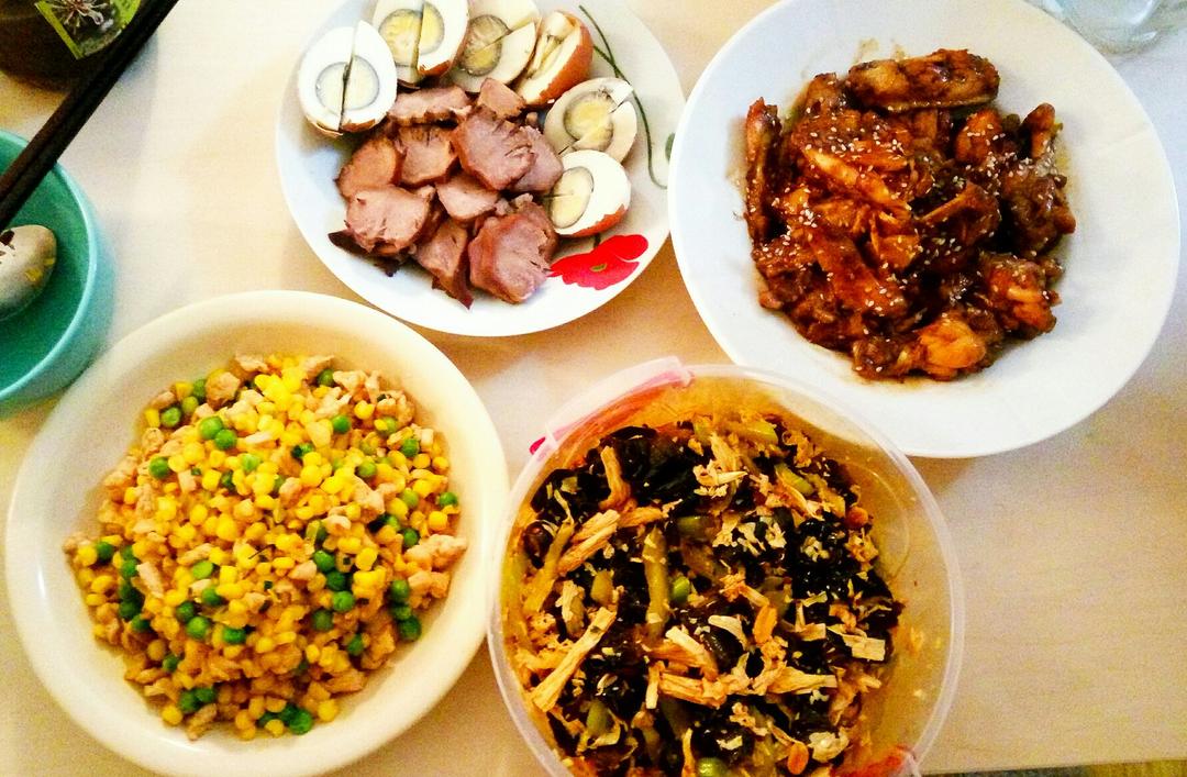 可乐鸡翅,卤香猪利,玉米青豆鸡丁,凉拌木耳。在国外能整出这几个菜...