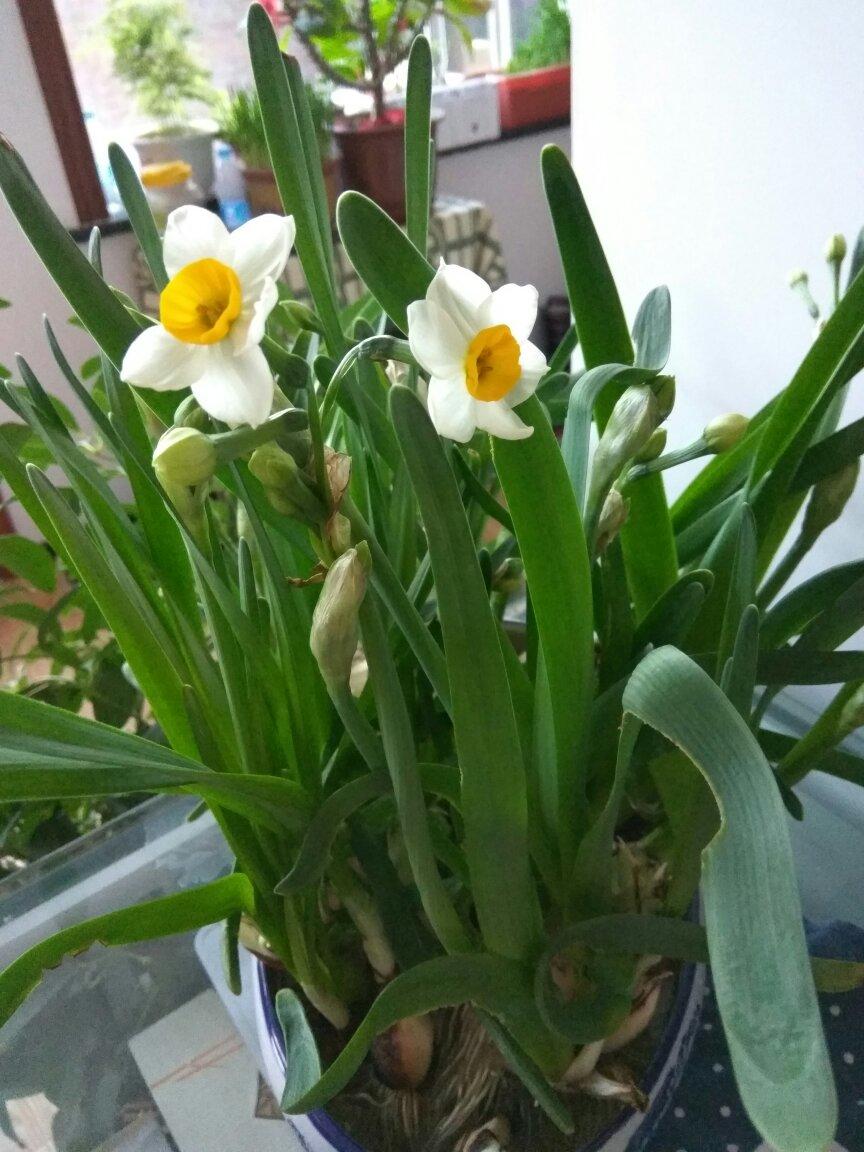 我家的水仙开花了,很香!只是屋里的温度有点高,...