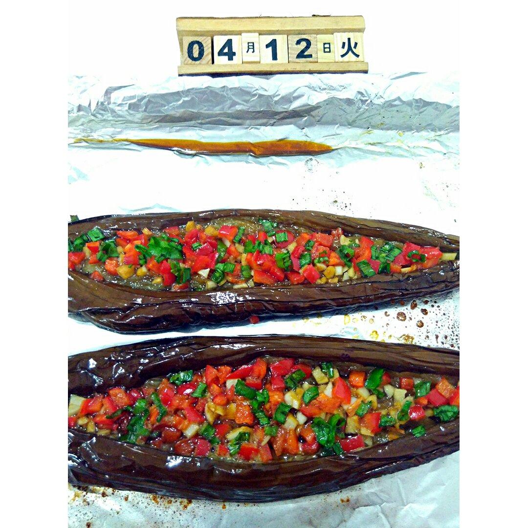 烤箱做的烤茄子 太烫了 不知道怎么取出来 放在烤盘上吃 哇咔咔!满屋子香气~