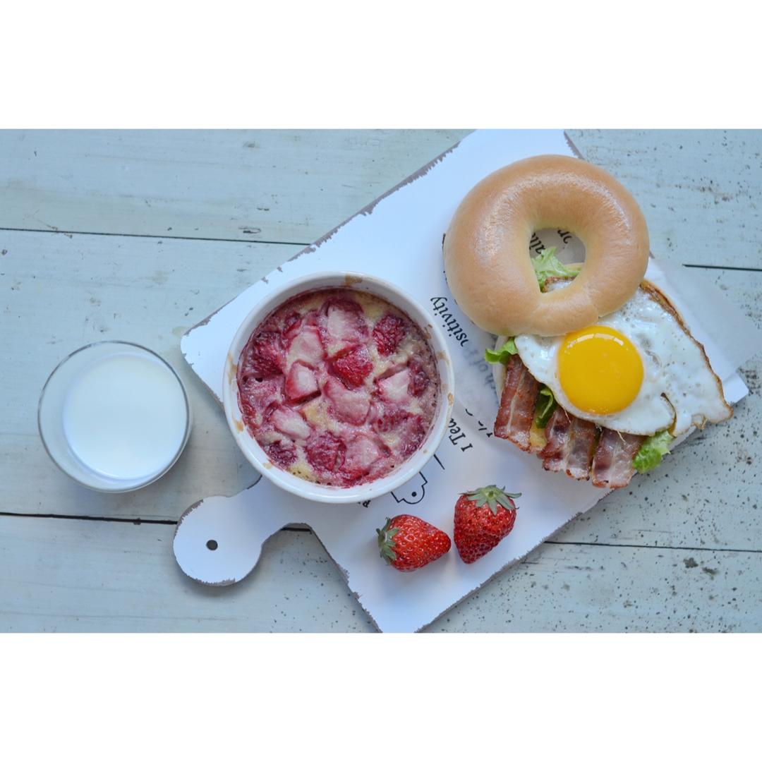 继续贝果日 今天培根煎蛋贝果 贝果切开放油里煎了下就是特别好吃 昨天买的草莓 顺带刷下自己菜谱
