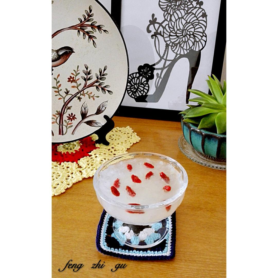 玻璃碗盛了稠稠的桃胶,浑圆的红枣趴在上面荡漾,洋红色的枸杞...