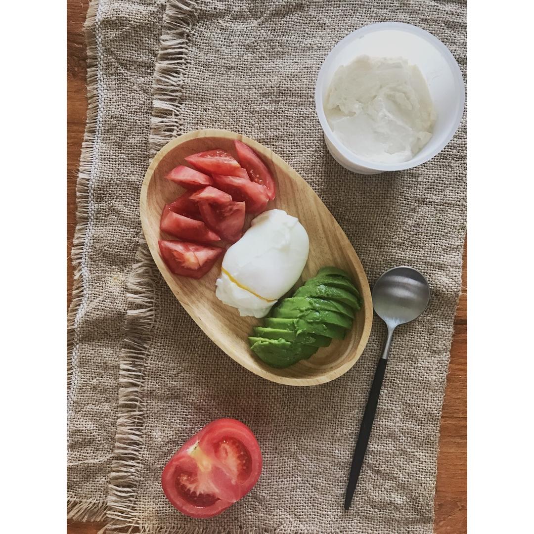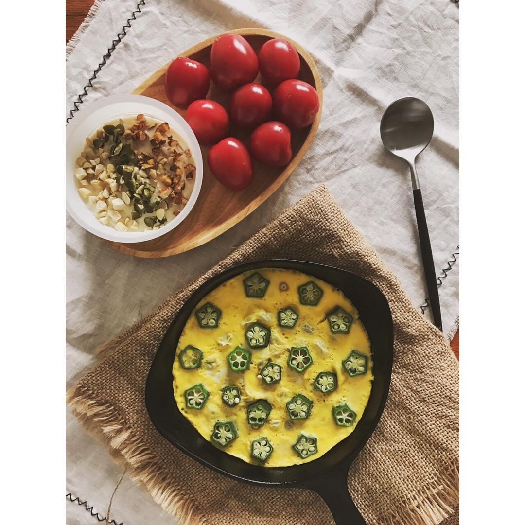 自己做的希腊酸奶泡了一晚燕麦,撒一点坚果碎,秋葵和蛋尊好吃~