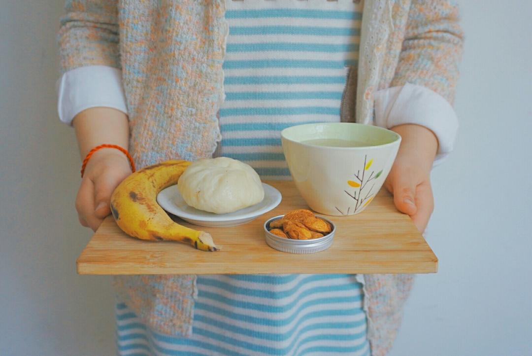 杂粮米糊+荠菜肉包+香蕉坚果