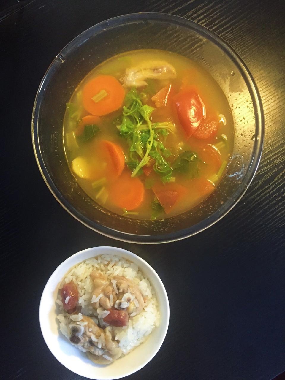 简单的杂菜滚鸡汤+腊肠鸡焗饭~