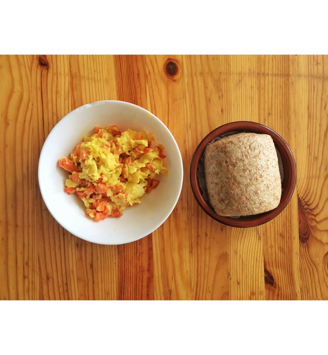 加了芝士的鸡蛋炒胡萝卜和杂粮馒头