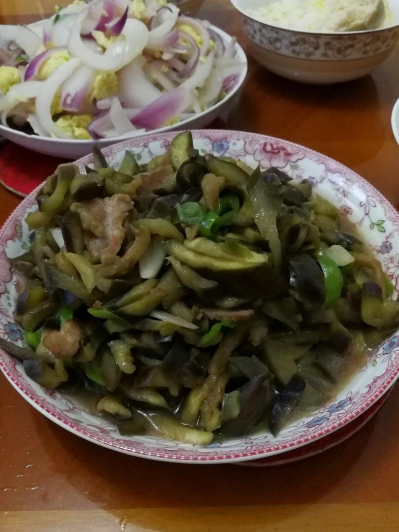 青椒茄子炒肉 洋葱炒鸡蛋,大枣馒头,小米粥,米饭。