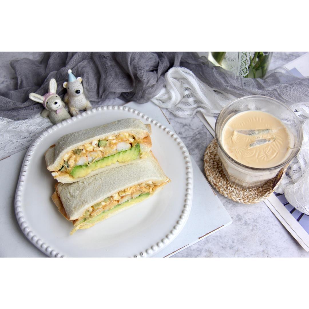 今日朝食:酸黄瓜芝麻酱鸡蛋沙拉牛油果蟹肉烤三明治🥪➕伯爵奶茶☕...