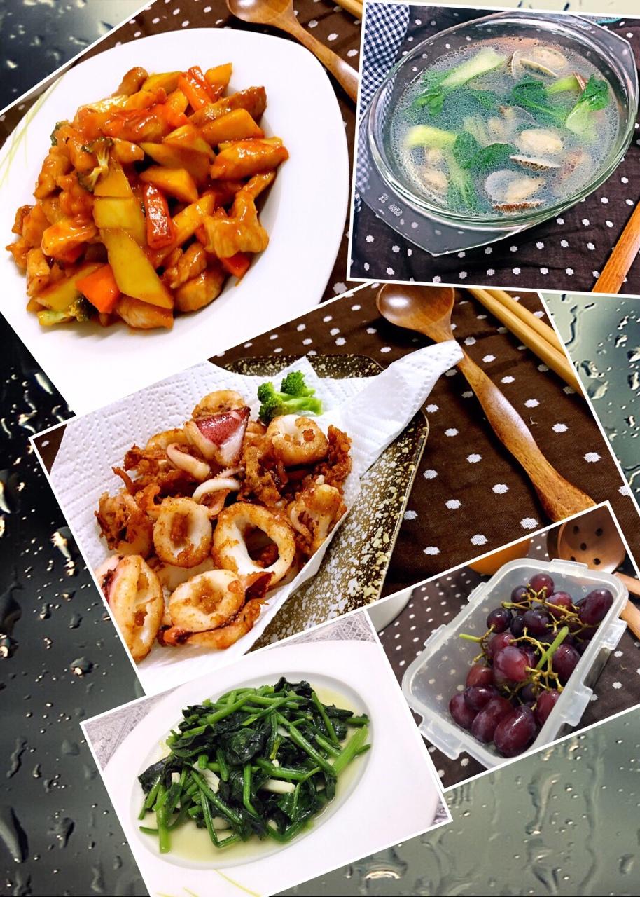 菠萝咕嚕肉+炸小魷魚圈+炒菠菜