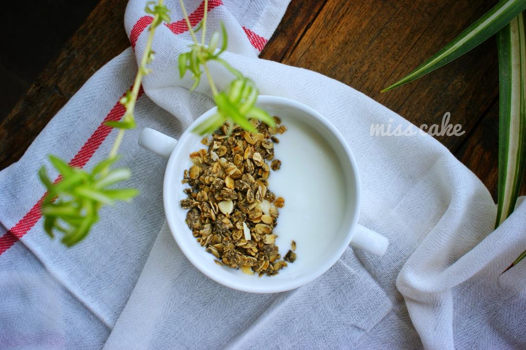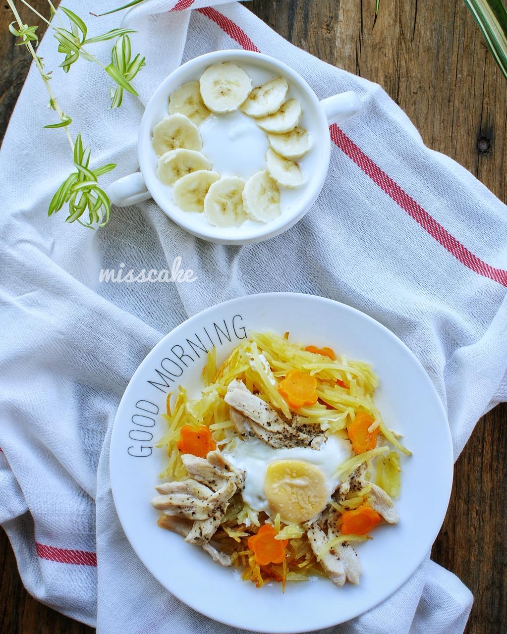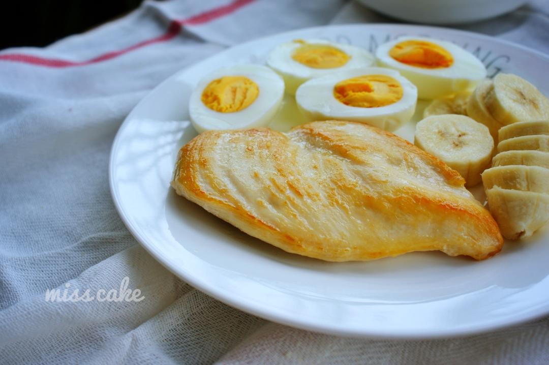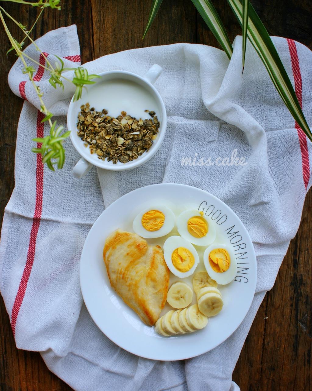 米可早餐D480:酸奶配机灵麦片(黑芝麻蔓越莓味),煮鸡蛋,煎鸡胸肉,香蕉。