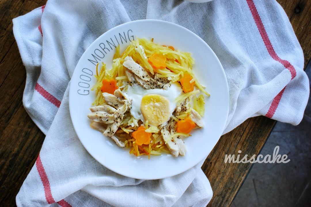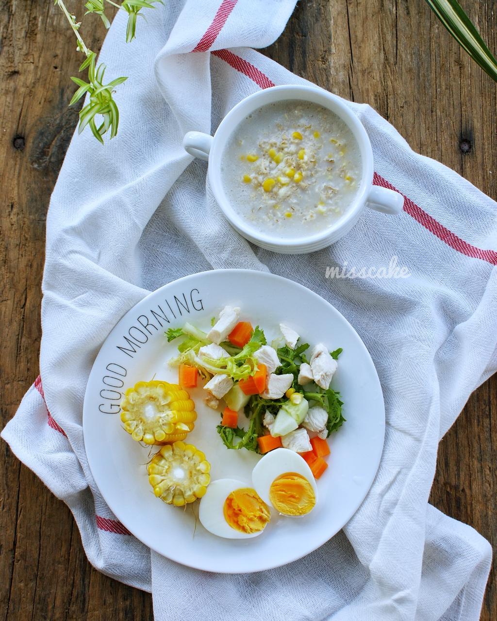 米可早餐D481:玉米燕麦粥,煮玉米🌽、煮鸡蛋🥚,鸡胸肉蔬菜沙拉🥗。